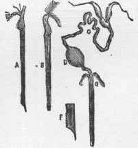 A, sting of bee ; S, sheath of sting; F, end of sting, greatly magnified, showing six barbs curved upwards ; B, glands for secreting poison; C, ducts through which it flows to D, where it is kept ready for use ; O, circular dilatation to pre vent sting being thrust too far out of sheath.